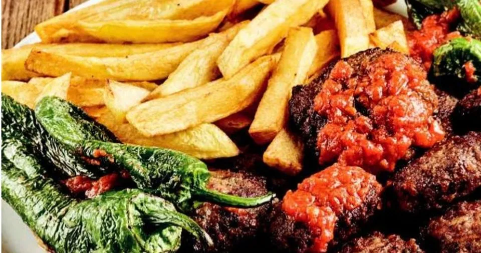 Kıymayı yoğurma kabına alıp, rendelenmiş soğan, rendelenmiş sarmısak, yumurta, ıslatılıp suyu sıkılmış ekmek içi, kimyon, karabiber, kıyılmış maydanoz ve tuz ekleyip iyice yoğurun. Harçtan yumurta büyüklüğünde parçalar koparıp elinizle şekil verin. Sıvı yağı tavaya alıp orta ateşte kızdırın. Köfteleri önlü arkalı kızartın. Patates kızartması için patateslerin kabuklarını temizleyip parmak şeklinde uzun doğrayın. Derin bir tavada ısıtılmış sıvı yağda kızartın. Fazla yağını almak için kağıt havlu üzerine çıkarın ve tuz serpin. Domates sos için rendelenmiş domates, kıyılmış sarmısak, sirke, toz şeker ve tuzu tavaya alıp, ara sıra karıştırarak 5 dakika pişirin. Sosu köftenin üzerine gezdirip, kızarmış patatesle birlikte sıcak olarak servis yapın