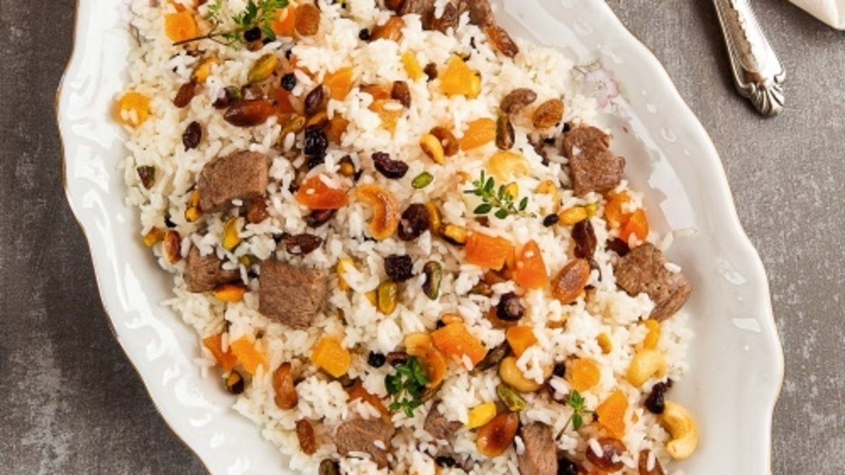 Pirinci ve tüm meyveleri ilave edin. Tuz, tarçın, karabiber ve yenibahar ile tatlandırıp et suyunu ekleyin. Et suyu kaynayana kadar hızlı sonrasında ise kısık ateşte pirinç taneleri suyu çekene kadar pişirmeye devam edin.