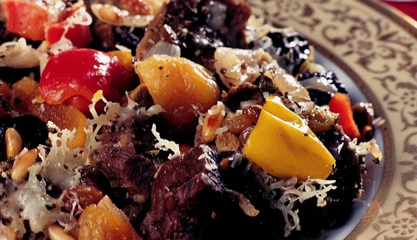 Etleri tuzlu suda haşlayıp, süzgeçten geçirin. Bir kaseye alın. İkiye bölünmüş kuru kayısı, çekirdeği çıkarılmış kuru erik, yıkanmış kuru üzüm, hindistancevizi, dolmalık fıstığı ekleyin. Hepsini harmanlayıp, bir fırın tepsisine yayın. Soğanları iri küp biçiminde doğrayın. Margarin ile tavada soteleyin ve ocaktan alın. Limon suyu, hardal, tuz, karabiber, kekik, nişasta ve dilerseniz etin haşlama suyundan biraz alıp karıştırın ve tepsideki etlerin üzerine gezdirin. En üste rendelenmiş kaşar peyniri serpin. Önceden ısıtılmış 200 derece fırında 5-10 dakika pişirin. Kıymayı tencereye alın. Soğanı mikserde püre haline getirin. Sarmısağı ince kıyın. Daha sonra tencereye ilave ederek karıştırın. Kısık ateşte 1 saat kavurun. Karabiber, tuz, kırmızı tozbiber ve pulbiberi ekleyerek 1-2 saniye karıştırıp ocaktan alın. Krep hamurunu hazırlamak için un, süt, yumurta, tozşeker ve tuzu çırpma teli ile 10 dakika çırpın. Başka bir tencereye tel süzgeç ile süzün. Sıvıyağı fırça ile tavaya sürün. Hamuru daha sonra tavaya dökerek kısık ateşte 2-3 dakika pişirin. Diğer kreplere de aynı işlemi uygulayın. Soğuyan harcı avuç içinde sıkarak kreplerin içine yerleştirin. Kenarlarını içe doğru kıvırıp rulo yapın. Önce yumurta daha sonra galeta ununda paneleyin. Fritözde kızartıp sıcak olarak servis yapın.