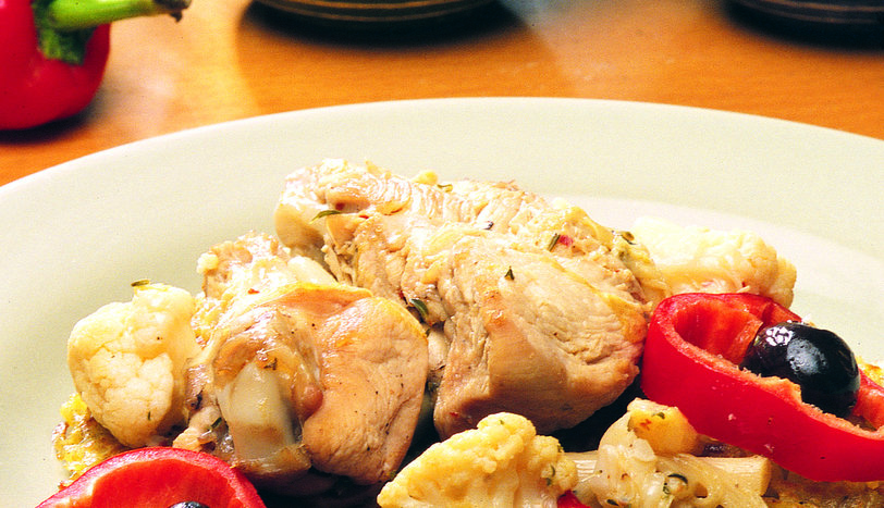 BiR tencereye zeytinyağını koyup, orta ateşli ocağa alın. Isınınca tavukları atın. Önlü arkalı soteleyin. Beyaz şarabı üzerine ekleyerek tencerenin ağzını kapatın. Zeytinleri ve dolmalık fıstıkları ilave edip, tahta bir kaşık yardımı ile karıştırın. Tuz ve karabiberi ekleyin. Tencerenin ağzını kapatıp, kaynamaya bırakın. Kaynadıktan sonra, doğranmış kuşkonmaz ve karnabaharları ekleyin (konserve kuşkonmaz kullanılıyorsa karnabaharları önce atıp, pişmesine yakın kuşkonmazları ekleyin) Piştikten sonra tencerenin altını kapatın. 1 Patatesleri rendeleyip bir kapta tuz ve biberle ovun ve suyunu sıkarak teflon bir tavaya alın. Harlı ateşte karıştırarak kavurun. 2 Patatesler yumuşayınca, ta-vanın şeklini vererek önlü arkalı kızartın. Kızartma yaparken tereyağının bir kısmını tavanın kenarlarına sürün (patatesler birbirine yapışacaktır). 3 Patatesler kızarınca, servis yapacağınız tabağa alın. Tavukları ve sebzeleri üstüne ekleyin. Tabağı dilediğiniz gibi süsleyerek servis yapın.