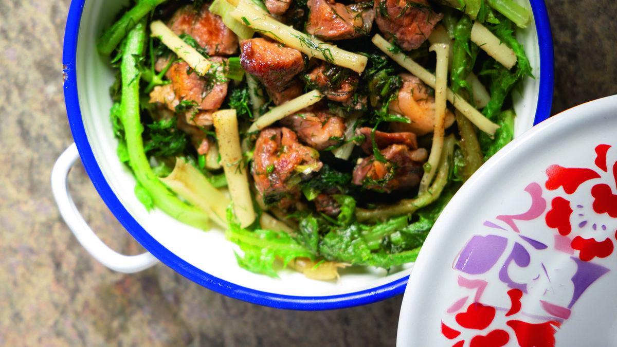 Arapsaçını, şevket-i bostanı ve yapraklı kısmını da ekleyip sotelemeye devam edin. Sebze suyu, tuz ve karabiber katın. Kaynayana kadar harlı kaynamaya başlayınca kısık ateşte pişmeye bırakın.