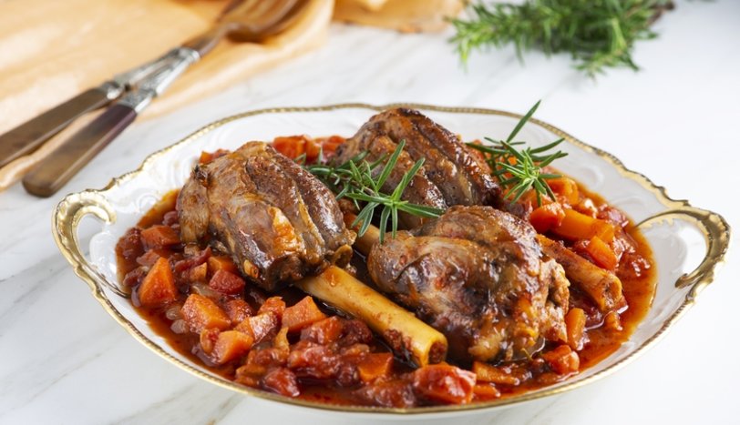 Tuz ve karabiberle incikleri harmanlayın. Kızgın döküm tencerede 4-5 dakika mühürleyin ve servis tabağına alın. Tereyağını döküm tencereye koyun. Soğan ve havuç katıp 4-5 dakika soteleyin. Salçayı ekleyip iyice karıştırın. Kemik suyu ve domates sosunu ilave edin.
