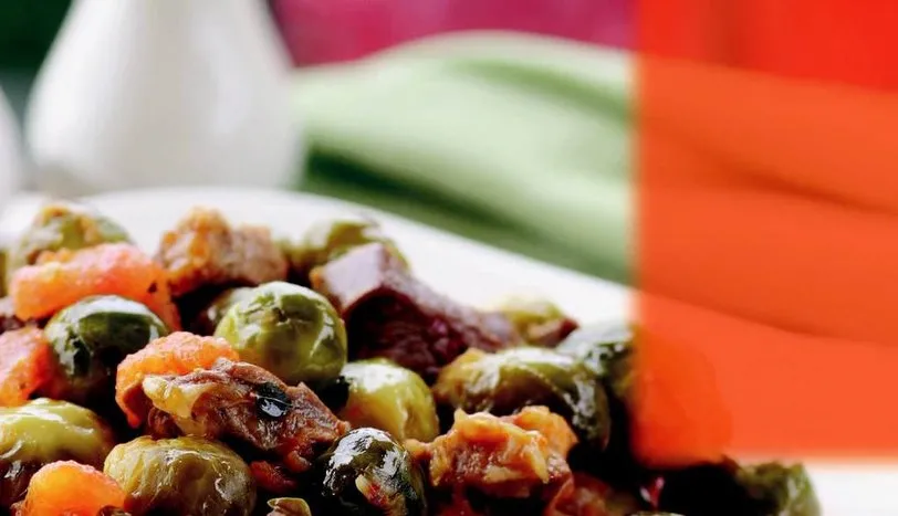 Tereyağını yayvan bir tencereye alıp eti kavurun. Üzerine tuz ve karabiber ekleyip tavadan alın. İri doğradığınız soğan ve ince kıyılmış sarımsağı aynı tencereye alıp, pembeleşene kadar kavurun. Üzerine eti ekleyin. Et suyunu ilave edip pişmeye bırakın. Brüksel lahanalarını temizleyin. Domateslerin kabuklarını soyup küp doğrayın. Etler yumuşayınca, brüksel lahanası, domates, tuz, karabiber ve kekiği tencereye ekleyin. 10 dakika pişirip zeytinyağını yemeğin üzerine gezdirin. 5 dakika daha pişirip servis yapın.