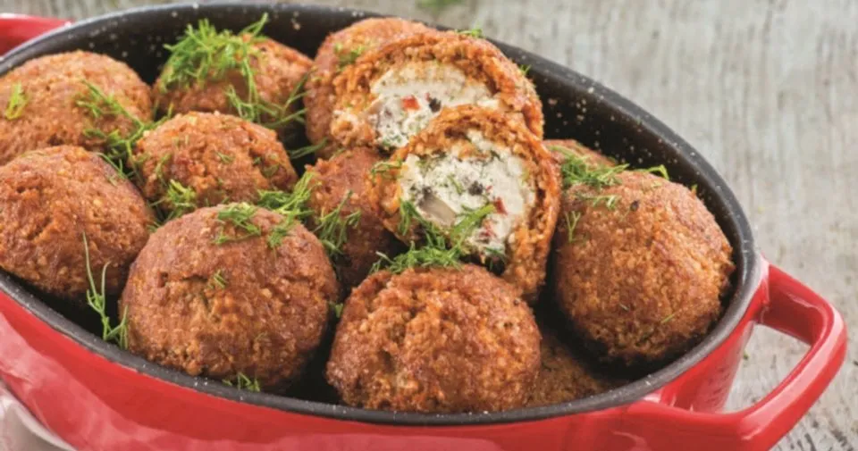 İç malzeme için labne peynirini süzüp kenara alın. Mantarların saplarını kesin. Üzerine sirke dökülmüş havlu kağıt ile sildikten sonra küp doğrayın. Kırmızı biberi yıkayıp ikiye bölün ve çekirdeklerini çıkartıp küçük küp şeklinde doğrayın. Taze soğan ve dereotunu yıkayıp ince kıyın. Zeytinyağını bir tavaya alıp iyice ısıtın ve mantarları tavaya alıp, yüksek ateşte kavurun. Suyunu salıp çektikten sonra üzerine sarmısak ekleyip karıştırın ve ocaktan alın. Üzerine ince kıyılmış taze soğan ilave edip soğumaya bırakın. İyice soğuttuğunuz karışıma labne, dereotu, tuz ve karabiber ekleyip kenara alın. Köfte için ince bulgur ve irmiği kapaklı bir kaba alıp karıştırın. Üzerini geçecek kadar sıcak su ekleyip kapağını kapatın. Karışım şişip soğuyana kadar oda sıcaklığında bekletin. Üzerine rendelemiş soğan ve kalan malzemeyi katın. Macun kıvamına (elinizle rahatça şekil verecek kadar yapışkan olması gerekir) gelene kadar iyice yoğurun. Hazırladığınız harçtan ceviz büyüklüğünde parçalar koparın. Elinizi hafifçe ıslatıp bir parçayı avcunuza alın. Ortasına parmağınızla bastırıp ince kabuklu bir oyuk oluşturun. İçine labneli mantarlı malzemeden koyup kapatın ve yuvarlayın. Kalan malzemeyi de aynı şekilde hazırlayın ve bol yağda kızartın.