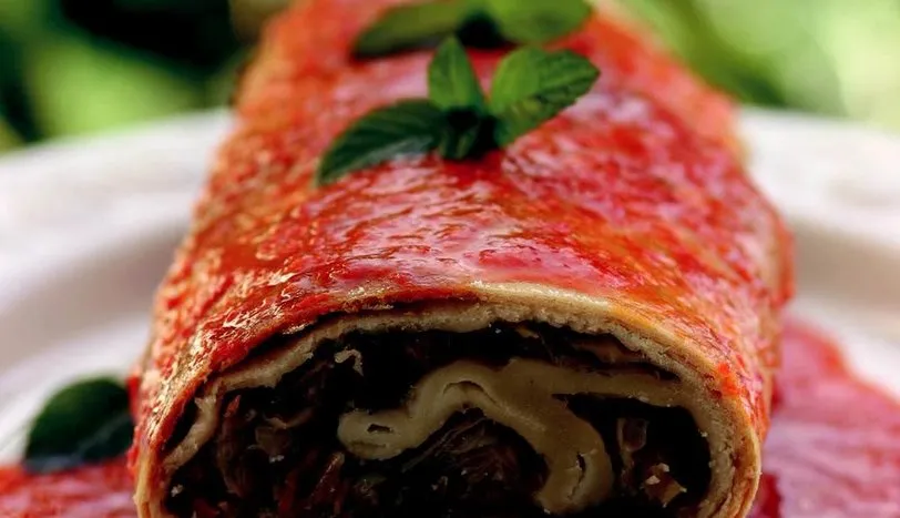 Hamuru hazırlamak için, unu eleyip derin bir kaba alın. Üzerine sıvıyağ, sirke ve tuz ekleyin. Ilık su ilave ederek yoğurun. Hamuru nemli bir bez örterek 30 dakika dinlenmeye bırakın. İçi için, lahanayı ince kıyın ve tuzla ovun. Biraz yumuşadığında yıkayıp süzün. Soğanı ince kıyın. Jambonu jülyen doğrayın. Dolmalık fıstığı yapışmaz yüzeyli tavada kısık ateşte kavurup, kenara alın. Küçük bir tencerede 1 su bardağı suyu kaynatın. Üzerine ufalanmış et suyu tabletini ekleyip eriyene kadar kaynatın. Diğer taraftan sıvıyağı ve tereyağını bir tencereye alıp kızdırın. İnce kıyılmış soğanı ilave edip rengi dönene kadar kavurun. Üzerine jülyen doğranmış jambonu ekleyip 2 dakika kavurun. Ovulmuş lahana, tozşeker, dolmalık fıstık, kuşüzümü tuz ve karabiber katıp 5 dakika birlikte pişirin. Et suyu tableti eklediğiniz suyu tencereye dökün. Kısık ateşte kapağı kapalı olarak 30 dakika pişirin. 4Bu arada dinlenen hamuru merdane yardımı ile 1-2 cm kalınlığında ve 50 cm çapında açın. Daha sonra bir mutfak bezinin üzerine alın. Ellerinizi yumruk yapıp hamurun altına koyun. Yavaş yavaş hamuru bir yandan gerip bir yandan yumruklarınızın üzerinden kaydırarak inceltebileceğiniz kadar inceltin. Hamurun kenarlarında kalan kalın kısımları bıçakla kesip çıkarın. 1 çorba kaşığı tereyağını eritip soğutun ve hamurun üzerine sürün. Hazırladığınız lahanalı harcı süzüp hamurun bir ucuna koyarak boydan boya yayın. Bezi kendi üzerine kaydırarak hamuru yuvarlayın. Daha sonra bez yardımı ile yağlanmış fırın tepsisine yerleştirin. Hamurun iki ucunu keserek düzeltin. Önceden ısıtılmış 200 derece fırına verip üzeri iyice kızarıncaya kadar yaklaşık 40 dakika pişmeye bırakın. 5Biber sosu için, 1 su bardağı suyu kaynatıp içine küçük parçalara böldüğünüz et suyu tabletini ilave edin. 5 dakika kaynatıp ocaktan alın. 6Kırmızı biberi temizleyip küçük küçük doğrayın. Sıvıyağ ve tereyağını bir tavaya alın. Üzerine ince kıyılmış soğan ve un ilave edip birlikte 2-3 dakika kavurun. Hazırladığınız et suyunu azar azar tavaya ilave edin. Koyulaşmaya başlayınca kırmızı biber, sirke, biber salçası, tozşeker, defne yaprağı, karabiber ve tuz ekleyin. Ara sıra karıştırarak 20 dakika pişirin. Sosu bir kaşıkla bastırarak süzgeçten geçirin. Limon suyu ekledikten sonra ştrudel ile birlikte servis yapın.