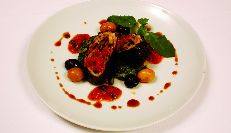 Patlıcanı ince doğrayıp zeytinyağına yatırın. Üzerine ince kıyılmış dereotu, maydanoz ve fesleğen ekleyip birkaç saat marine edin. Patlıcanları ızgarada kızartın. Levreği ikiye bölüp et tokmağı ile inceltin. Üzerine patlıcanların yarısını dizin. İkinci kat levreği yerleştirip kalan patlıcanları dizin. Rulo yapıp asma yapraklarına dolma şeklinde sarın ve ızgarada pişirin. Diğer tarafta sos için bir tavada 2 çorba kaşığı sızma zeytinyağı ile sarımsağı soteleyin. Kabuğu soyulup küp doğranmış domates, kapari, siyah ve yeşil zeytinleri ilave edip 5 dakika pişirin. Levreği servis tabağına alın. Sosu üzerine gezdirip servis yapın.