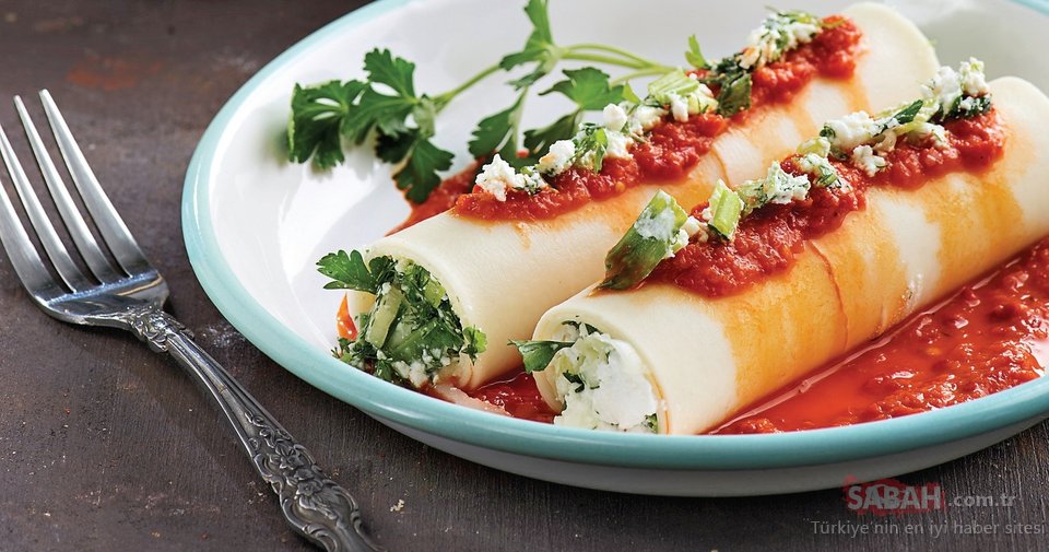 Zeytinyağını bir tavaya alıp karışımı 3-4 dakika soteleyin. İç malzemeden 2-3 yemek kaşığını süslemek için kenara ayırın. Dikdörtgen lazanya yapraklarının kısa kenarlarına iç malzemeden yerleştirip rulo şeklinde sarın. Ruloların üzerine hazırladığınız sosu gezdirip ayırdığınız harçtan koyarak süsleyin.