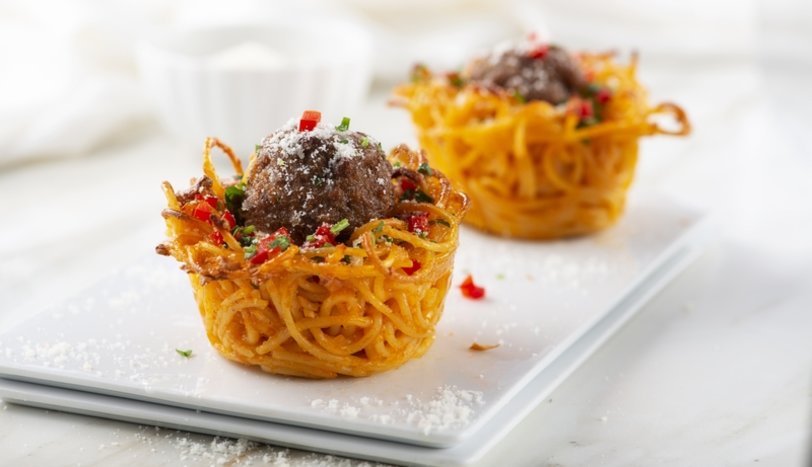 Yağlanmış porsiyonluk muffin kalıplarına alabildiği kadar makarna yerleştirin. Orta kısımlarına küçük boy bir bardağın tabanı ile bastırıp çukur oluşturun. Çukurlara köfteleri yerleştirin.