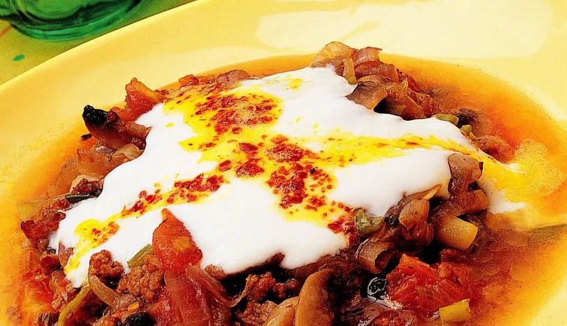 Kırmızı ve kuru soğanı piyazlık doğrayın. Mantarların saplarını çıkarıp halka halka doğrayın. Sivri biberlerin tohumlarını çıkarıp, taze soğanlarla incecik kıyın. Domatesleri küp doğrayın. Sarmısakları ayıklayıp ince ince kıyın. Yayvan bir tencerede zeytinyağını kızdırıp, içine kıymayı ilave edin. Kıyma suyunu çekene kadar kavurun. Daha sonra piyazlık doğradığınız soğanları, sarmısakları ekleyin ve soğanlar pembeleşene kadar kavurun. Sivri biber, taze soğan ve mantarları ilave edin. Mantarlar suyunu çekene kadar sote edin. Son olarak doğranmış domatesleri, kekiği, tuz, karabiber ve et suyunu ekleyip, bir taşım pişirin. Yemek pişerken küçük bir tavada tereyağını ve pulbiberi yakın. Servis tabağına aldığınız mantar mantısının üzerine, önce sarmısaklı yoğurt, ardından yağ-pulbiber karışımını döküp servis yapın.