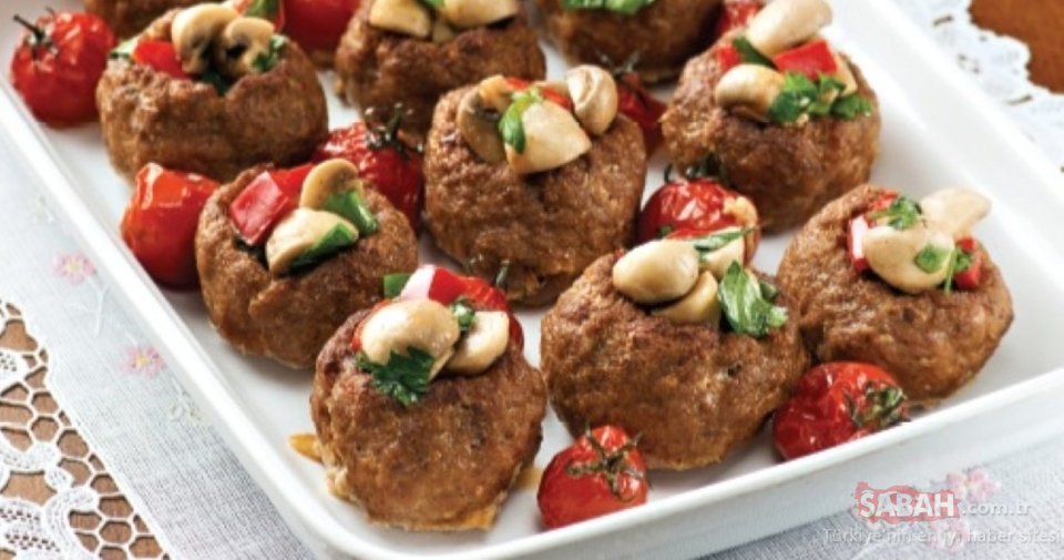 Harç için ayıklanıp doğranmış mantar ve zeytinyağını tavaya alın. Suyunu salıp çekene dek soteleyin. Küp doğranmış kırmızı biber, karabiber ve tuz ilave edip 5 dakika daha soteleyin. Ocaktan alıp, kıyılmış maydanoz ekleyerek karıştırın. Harcı köftelerin ortalarına pay edip servis yapın.