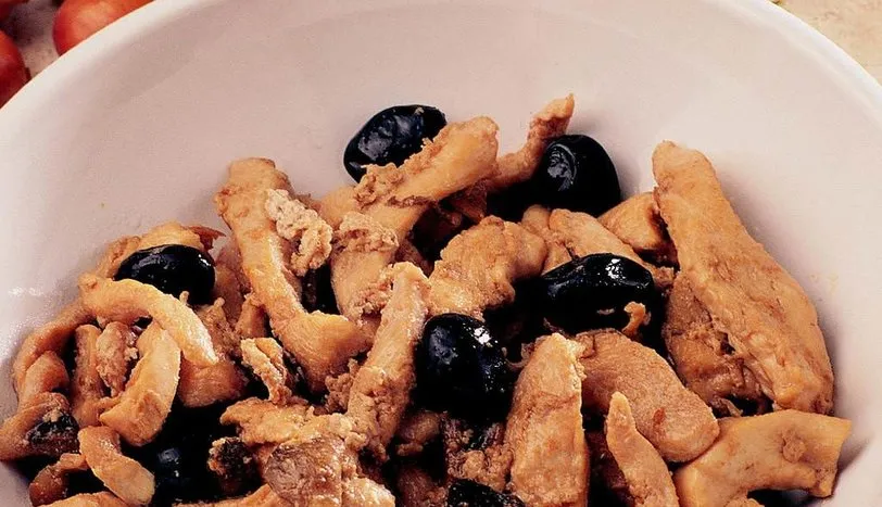 Tavuk etini şeritler halinde kesip, yumurta akı, 1 çorba kaşığı mısır nişastası, sirke, sarmısak, zencefil ve zeytinyağı karışımında yarım saat bekletin. Sıvıyağı tavada ısıtın. Tavuk etini karışımın içinden çıkardıktan sonra tavaya aktarın. Çok hafif kızarınca çekirdekleri çıkarılmış zeytin ve ince kesilmiş mantarları ekleyin. 1 dakika karıştırarak, pişirin. Soya sosu ve kalan mısır nişastasını ilave edip, tavuk suyunu ekleyin. Karabiber ve tuzunu ayarlayın. Suyunu çekene dek kaynatın. Dilerseniz yanında patates püresiyle birlikte servis yapın.