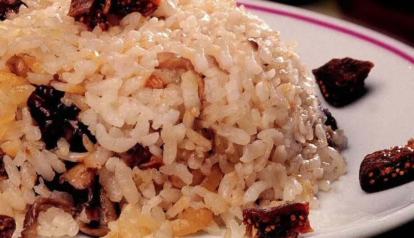 Pirinci tuzlu suda 20 dakika bekletin. Pilavın harcını hazırlayın. Bunun için, tavada 2 çorba kaşığı tereyağını eritin. Küçük doğranmış kuzu etini ekleyin. İnce doğranmış mantar, ceviz içi ve kuru üzümü de ekleyip, kavurmaya devam edin. Daha sonra iç malzemeyi kenara alıp, pilavı hazırlamaya başlayın. Bunun için, kalan 2 çorba kaşığı tereyağını bir tencereye alın. Suyunu süzdüğünüz pirinci ekleyin. İyice kavurun. Tuz ve suyu ekleyin. Tencerenin kapağını kapatıp, hafif ateşte pilavı pişirin. Pilav suyunu çekince, önceden hazırladığınız harcı ekleyip karıştırın. Üzerine ince kıyılmış dereotu ve maydanoz ekleyip servis yapın.