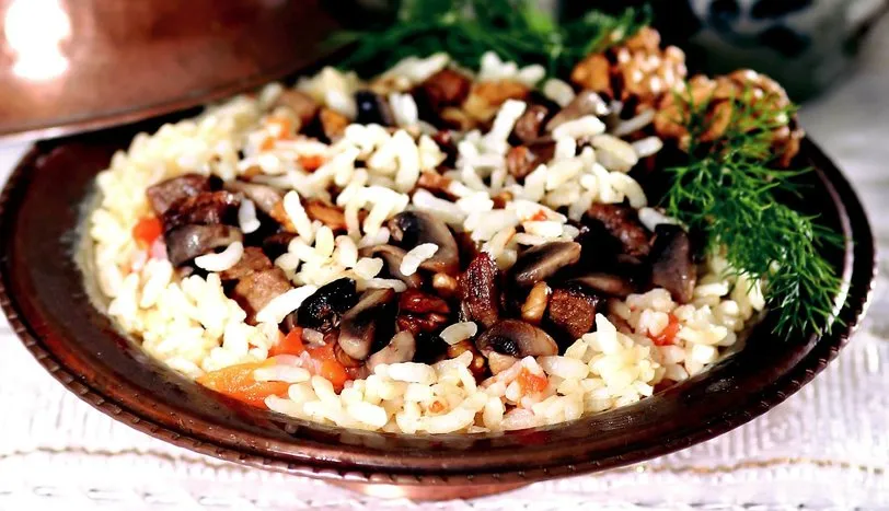 Yıkadığınız pirinci tuzlu sıcak suda 20 dakika bekletin. Tekrar sudan geçirip, suyunu süzün. 1 çorba kaşığı tereyağını bir tencereye alıp eritin ve kuşbaşı kuzu etini pembeleştirin. İnce kıyılmış soğanı ilave edip kavurmaya devam edin. Küp doğranmış mantar ve domatesi ekleyin. 1-2 dakika daha kavurduktan sonra 4 su bardağı et suyunu katın. Et suyu kaynadıktan sonra pirinci ilave edin. Göz göz olana kadar pişirip, ocağın altını kapatın. Pilavı 15 dakika dinlendirin. Geri kalan tereyağını bir tavada pembeleştirip demlenmiş pilavın üzerine gezdirin. Üzerine kekik ve ince kıyılmış ceviz serpin. Sıcak olarak servis yapınAŞÇININ NOTUYörede bu pilav, et yerine antep fıstığı ve bademle de pişirilir.