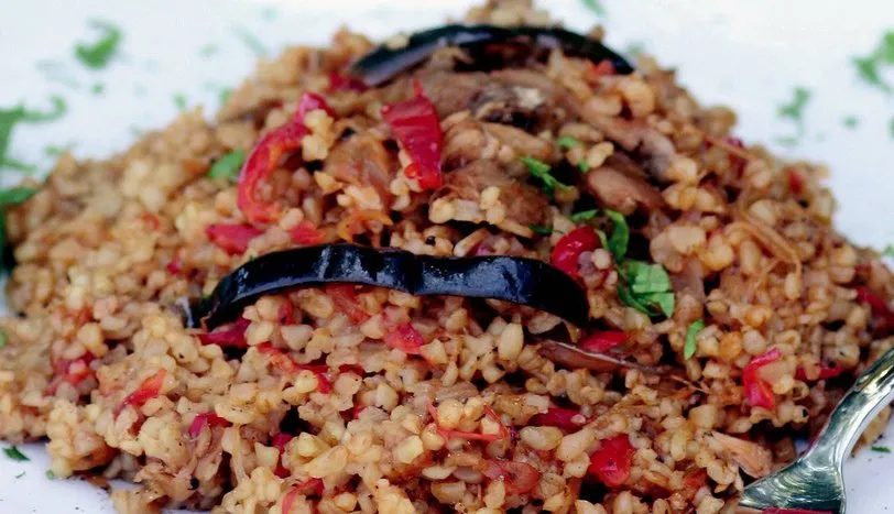 İnce kıyılmış soğanla sarımsağı sıvı yağ ve tereyağı ile derin bir tencereye alıp kavurun. İnce kıyılmış kırmızı ve yeşil biberleri ekleyip kavurmaya devam edin. Uzun şeritler halinde doğranmış patlıcanları ekleyip karıştırın. Küp doğranmış domates ve salçayı ekleyip karıştırın. Salça ve domatesler diğer sebzelerle özleşene kadar pişirmeye devam edin. Bulgur, didiklenmiş tavuk eti ve baharatları ekleyin. Et suyunu ekledikten sonra pilavın üzerini geçecek kadar su ilave edin. Pilavı kısık ateşte pişirip 10 dakika dinlendirin. Sıcak olarak servis yapın.