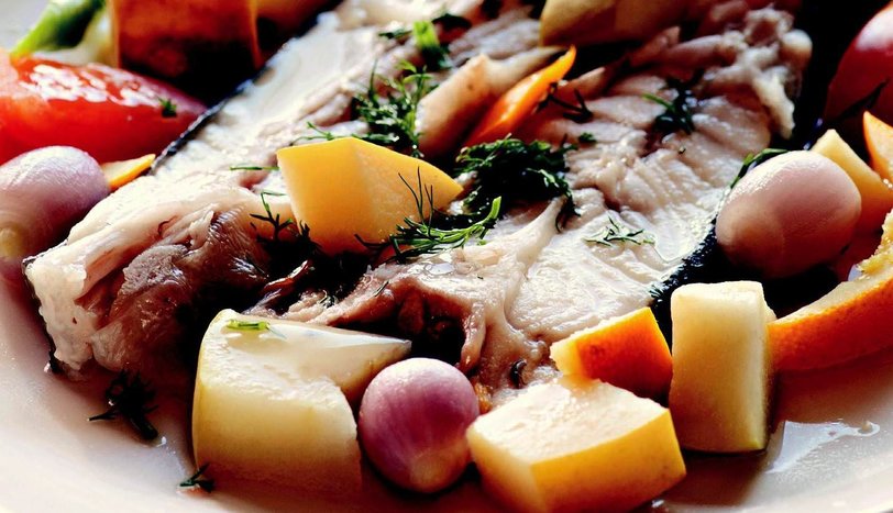 Temizlenmiş kalkanı dilimleyin ve fırın tepsisine dizin. Üzerine dilimlenmiş elma, ayva, portakal, armut, arpacık soğan, iri kıyılmış domates ile sivri biber ve defne yaprağını yerleştirin.