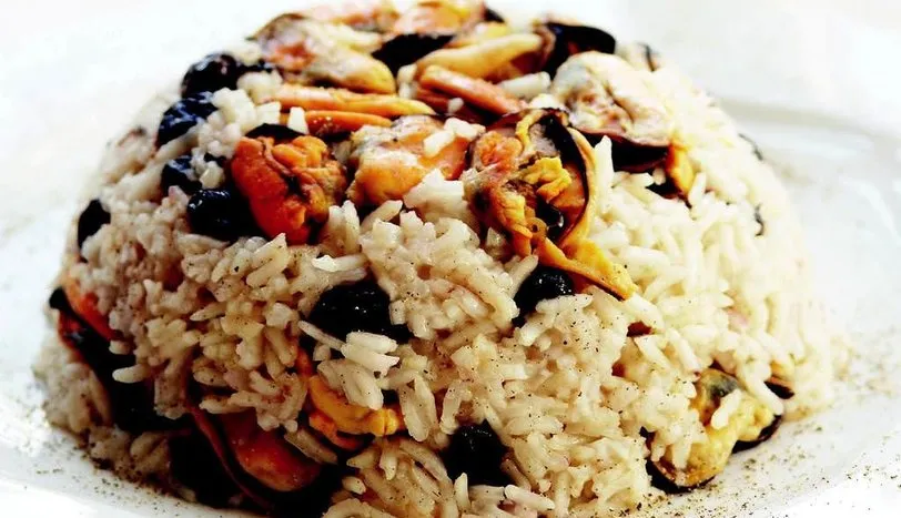 Pirinci iyice yıkayın ve süzgeçte bekletin. Midyeleri ayrı bir süzgece alıp çözülmeleri için bırakın. Pilav tenceresine tereyağı, kimyon, karabiber, üzüm ve tuzu koyup, pirinci ekleyin. Orta ateşte kavurun. 2 su bardağı kaynar suyu pirincin üzerine ekleyin ve bir- iki taşım kaynatıp demlenmeye bırakın. 2-3 dakika sonra, süzülmüş midyeleri pilavın üzerine serpiştirin ve pirinç yumuşayana kadar demlemeye devam edin. Sıcak olarak servis yapın.