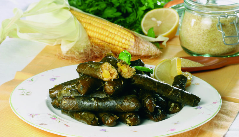 Buğdayı akşamdan suya koyun. Asma yapraklarını 4-5 dakika haşlayıp süzdükten sonra, soğumaya bırakın. Soğanları yemeklik doğrayıp 2 çorba kaşığı tereyağında hafifçe kavurun. Mısır, buğday ve bulguru ilave edin. Maydanoz ve dereotunu ince kıyın. Domatesleri rendeleyin. Kalan tereyağı, tuz, karabiber, domates, maydanoz, dereotu ve 1 su bardağı sıcak suyu tencereye ekleyip, ağır ateşte 10 dakika demlendirin. Nar ekşisi ve naneyi de ekleyin. Yaprakların içine, hazırladığınız harcı koyarak sarın. Üzerine yarım limon sıktıktan sonra, 2 su bardağı sıcak su koyarak, orta ateşte 25-30 dakika pişirin. Limon dilimleri ve fesleğen yaprakları ile süsleyerek servis yapın.