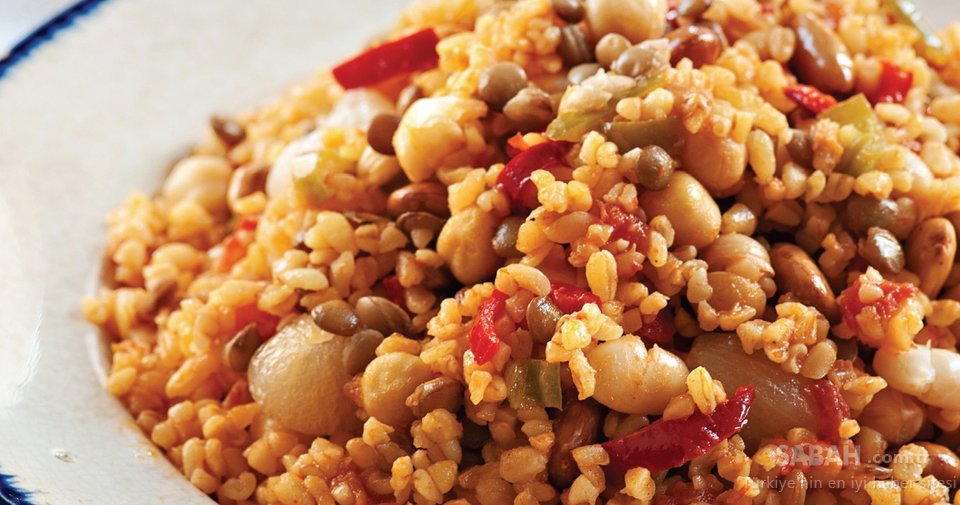 Bir tencereye tereyağını koyun ve eritin. Arpacık soğan ve bademi hafif pembeleşene kadar kavurun. Doğranmış biberleri ilave edip, 1-2 dakika soteleyin. Bulguru katın ve şöyle bir çevirdikten sonra et suyu veya tavuk suyu ekleyin. Kaynamaya başlayana kadar harlı, sonra suyunu çekene kadar kısık ateşte pişirin. Ocaktan aldıktan sonra nohut, yeşil mercimek, kuru fasulye, kuş üzümü, kıyılmış nane, tuz ve pul biberi ekleyin. Karıştırdıktan sonra sıcak olarak servis yapın.