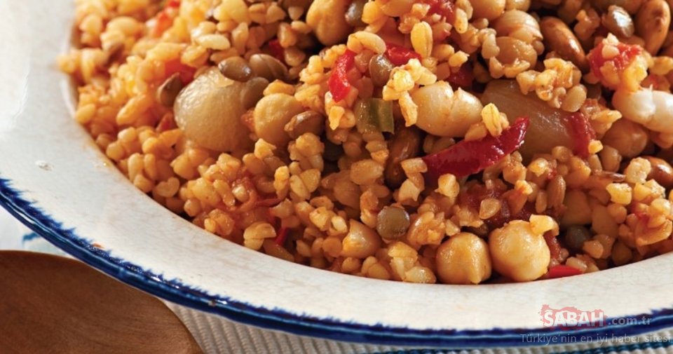 Bir tencereye tereyağını koyun ve eritin. Arpacık soğan ve bademi hafif pembeleşene kadar kavurun. Doğranmış biberleri ilave edip, 1-2 dakika soteleyin. Bulguru katın ve şöyle bir çevirdikten sonra et suyu veya tavuk suyu ekleyin. Kaynamaya başlayana kadar harlı, sonra suyunu çekene kadar kısık ateşte pişirin. Ocaktan aldıktan sonra nohut, yeşil mercimek, kurufasulye, kuşüzümü, kıyılmış nane, tuz ve pulbiberi ekleyin. Karıştırdıktan sonra sıcak olarak servis yapın.