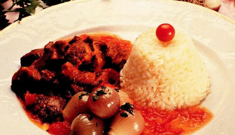 Tereyağını geniş bir tavaya alıp eti soteleyin. Üzerine dövülmüş sarmısağı, salçayı, suyu, karabiberi, kimyonu ve tuzu ilave edin. Su kaynamaya başlayınca temizlenmiş soğanları ilave edin. Soğanlar yumuşayınca ocaktan alıp pilavla birlikte servis yapın.
