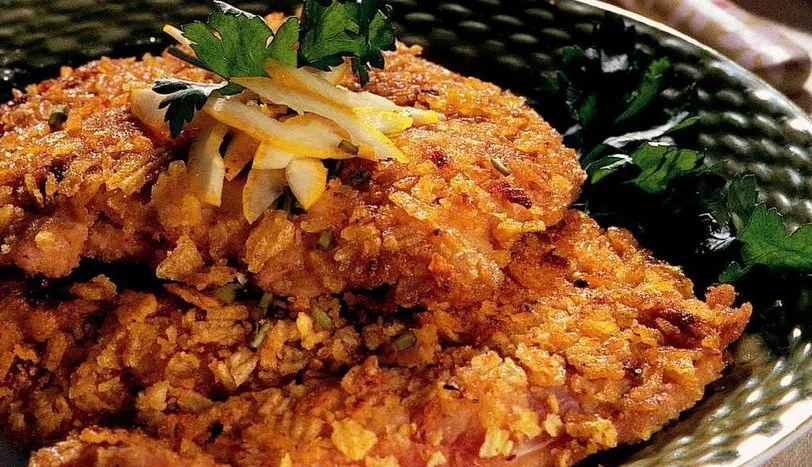 Bir kapta galeta ununu, tuzu ve karabiberi karıştırın. Dövülmüş tavuk göğüslerini galeta unlu karışıma, her tarafını kapatacak şekilde bulayın. Ayrı bir kaba cipsleri ufalayın ve hazırladığınız tavuk etinin iki yüzünü, cipsle kaplayın. Bir tavaya tereyağını aktarıp, tavukları arkalı önlü 5-6 dakika kızartın. Domates dilimleri ve maydanozla süsleyip servis yapın.