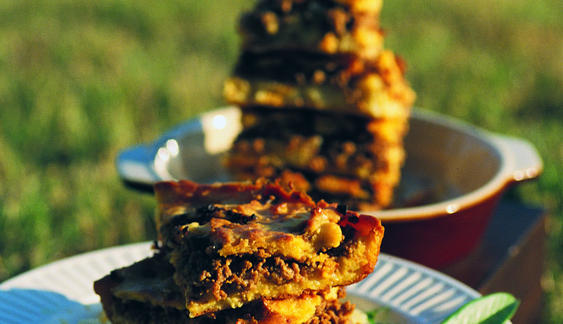 HAMURU için, tereyağını bir tencerede eritip unu ve tuzu ilave edin ve devamlı karıştırarak hafif ateşte bir süre kavurun. Ardından sütü ilave edin ve karıştırmaya devam edin. Ateşten alıp ılınmaya bırakın. Yumurtaları ilave edip, hamuru yoğurun. Elde ettiğiniz hamuru iki parçaya bölüp, yarım saat buzdolabında bekletin. Patatesli harç için, patateslerin kabuklarını soyup ufak parçalara doğrayın. Bir tencerede su kaynatıp tuz ilave edin. Kaynamış suya doğranmış patatesleri atıp yumuşayıncaya dek haşlayın. Sonrasında suyunu süzdürüp patatesleri iyice ezin ve soğumaya bırakın. Sonra yumurtaları ve kaşar peynirini ekleyip karıştırın. Kıymalı harç için, bir tavaya tereyağını ve ince kıyılmış soğanları koyup, soğan pembeleşene dek kavurun. Üzerine kıymayı, tuzu ve karabiberi ekleyip, kıymanın rengi dönene dek kavurmaya devam edin. Ardından yarım bardak su ile ezilmiş salçayı katıp 5-10 dakika daha pişirin. Hamurun bir parçasını yağlanmış tepsiye alıp, tepsinin kenarlarından taşacak biçimde, elle bastırarak hamuru genişletin ve yerleştirin. Bir kat patatesli karışımı, bir kat kıymalı karışımı yerleştirin. Üzerine elle genişletilmiş ya da merdaneyle açılmış diğer hamur parçasını örtün. Son olarak üzerine, çırpılmış yumurtayı sürün. Önceden ısıtılmış 200 derece fırında, 35-40 dakika, kızarana dek pişirin. Dilimleyip servis yapın.