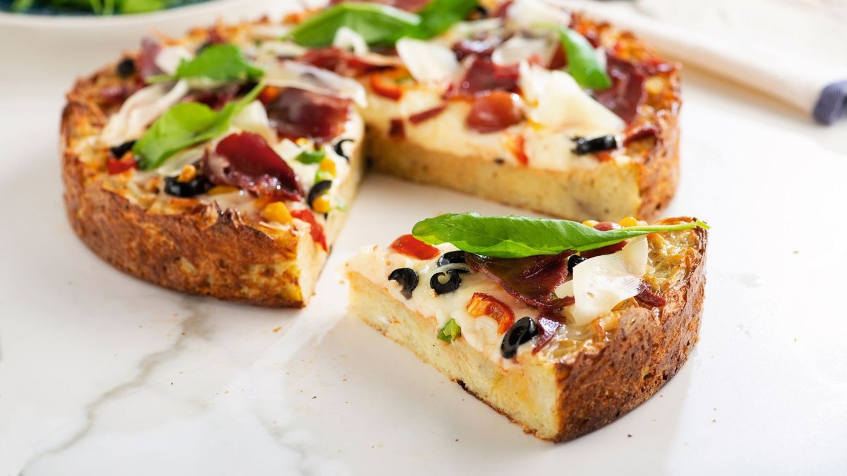 Patatesleri rendeleyin. Üzerine un, yumurta, tuz ve karabiberi ilave edin ve yoğurun. Pişirme kağıdı ile kaplanmış orta boy ve yuvarlak kelepçeli kek kalıbına yayın. Önceden ısıtılmış 180 derece fırında 20 dakika pişirin.