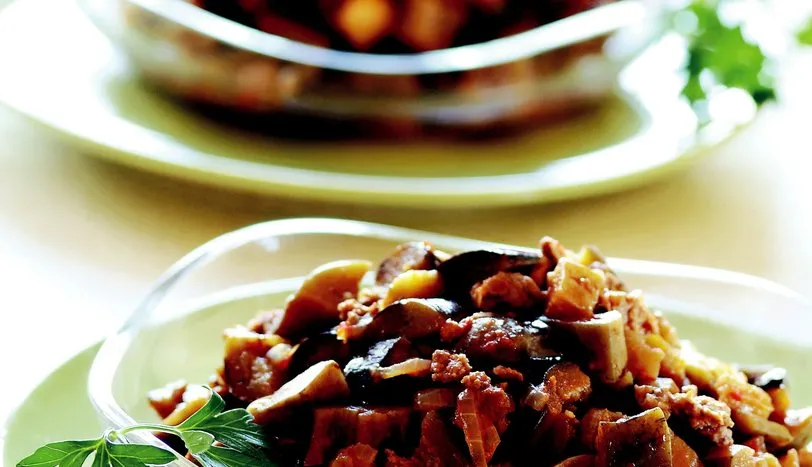 PATLICAN turşusunu bir kaba alıp üzerine su ekleyin. Tuzunu almak için suyunu birkaç kez değiştirerek, 1-2 saat suda bekletin. İyice süzüp, küp doğrayın. Kıymayı bir tencereye alıp, suyun salıp çekene dek kavurun. Üzerine tereyağı, sıvıyağ ve yemeklik doğranmış soğanı katın. Soğan pembeleşince, salçayı ilave edin. Birkaç dakika kavurduktan sonra patlıcan turşusu ve pulbiber ekleyip, 5 dakika daha kavurun. Et suyunu ve suyu katın. Kısık ateşte suyunu çekene dek pişirip servis yapın.