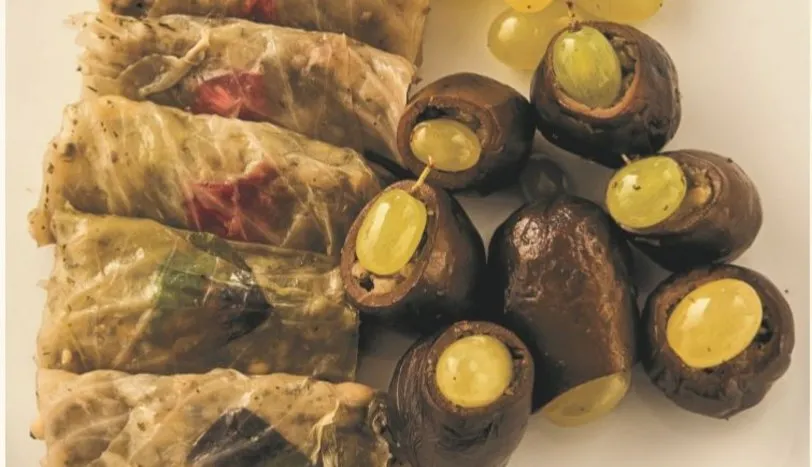 Dolma içini hazırlamak için soğanları soyup küçük doğrayın. Maydanoz ve dereotunu kıyın. Soğanı, tuz ve karabiberle yağsız olarak soteleyin. Soğanın kokusu değiştiğinde zeytinyağını ve yıkanmış pirinci ekleyin. Şeffaflaşıncaya kadar kavurun. Suyun yarısını ve kakuleyi ilave edip kısık ateşte suyunu çekene dek pişirin. Ocağı kapatıp, kuş üzümü, fıstıkları, limon kabuğu rendesini, maydanoz ve dereotunu karıştırıp dinlenmeye bırakın. 2 Patlıcanları oyun ve tuzlu suya alın. Lahanayı yapraklarına ayırın çok az haşlayın. Sert kısımlarını çıkarın. Hazırladığınız iç ılınınca patlıcanların içini doldurun. Lahana yapraklarına harçtan koyup sarın ve son katına birer adet begonya, papatya veya kadife çiçeği koyun. Dolmaları aynı tencereye yerleştirin ve çok az su ilave edip pişirdikten sonra soğumaya bırakın. Patlıcan dolmalarını servis edeceğiniz tabağa dizerken üstlerini taze üzümle kapatın.