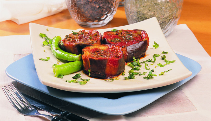 PatlIcanlarI alacalı olarak soyup, tuzlu suda yarım saat bekletin. Sudan çıkarıp, iyice kurulayın. Bu arada patlıcanların içini hazırlayın. Bunun için, bir kapta kıyma, ufalanmış ekmek içi, rendelenmiş soğan, dövülmüş sarmısak, ince kıyılmış maydanoz, tuz ve baharatı iyice yoğurun. Patlıcanları üç parmak genişliğinde dilimleyin. İç kısımlarını kabak oyacağı ile çıkarın. Patlıcanların içine, hazırladığınız kıymalı harcı doldurun (dilerseniz köfte şekli vererek de patlıcanların içine yerleştirebilirsiniz). Patlıcanları düdüklü tencereye yerleştirin. Üzerine salçalı su ilave edin. Düdüklü tencerenin kapağını kapatın. Yüksek ateşe oturtun. Basınç gösterge çubuğunda 1. halka görünene kadar bekletin. Daha sonra tencereyi en küçük ocağa alıp, 3 dakika pişirin. Düdüklü tencereyi, basınç gösterge çubuğu tamamen inene kadar suyun altında bekletin. Kapağı açıp, patlıcanları servis tabağına alın. Dilerseniz bu şekilde ya da üzerine dilimlenmiş domates ve biber koyarak servis yapın.
