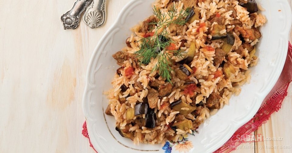 Pirinci yıkayıp tuz eklenmiş ılık suda 15 dakika bekletin. Daha sonra süzüp sudan geçirin ve kenara alın.Patlıcanları alacalı soyup küp doğrayın. Acısını almak için tuzlu suda 15 dakika bekletin. Sudan geçirip kurulayın.