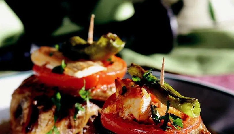 Tavuğu bir tencereye alın. Üzerine su ve kabukları soyulmuş 1 adet bütün soğan ekleyin. Haşlayıp kenara alın. Patlıcanı alacalı soyup boylamasına şeritler halinde doğrayın. Acısını almak için tuzlu suda 15 dakika bekletin. Sudan geçirip kurulayın ve sıvıyağda kızdırıp kenara alın. Sivri biberleri ikiye bölüp çekirdeklerini çıkarın. Domatesleri dilimleyin. Tavuk parçalarını kızarmış patlıcan dilimleri ile sarın. Üzerine birer parça biber ve domates yerleştirin. Kaymaması için kürdanla tutturun. Daha sonra tavukları bir fırın tepsisine yerleştirin. Diğer taraftan tereyağını kızdırıp, unu rengi dönene kadar kavurun. Üzerine salçayı ilave edin. 1-2 dakika sonra su, tuz ve baharatları ilave edin. 5 dakika kaynatıp ocaktan alın. Hazırladığınız sosu tepsideki tavukların üzerine dökün. Önceden ısıtılmış 200 derece fırında 10- 15 dakika pişirin. Kıyılmış maydanoz serperek servis yapın.