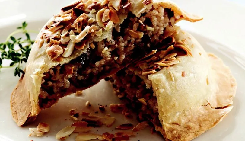Pirinci yıkayıp ılık suda yarım saat bekletin. Zeytinyağı ve 2 çorba kaşığı tereyağını bir tencereye alıp, dolmalık fıstığı rengi dönene dek kavurun. Üzerine süzülmüş pirinci ilave edin ve beyazlaşana dek kavurun. Daha sonra suyu ve kuş üzümünü ekleyin. Tuz ve karabiberini ayarlayıp kısık ateşte suyunu çekene dek pişirin. Tencerenin üzerine kağıt havlu kapatın ve demlenmeye bırakın. Hamuru için unu geniş bir kaba alıp ortasını havuz şeklinde açın. Yumurta, tereyağı (birazını ayırıp) ve tuz koyup yoğurun. Üzerine nemli bir bez örterek oda sıcaklığında yarım saat bekletin. Diğer taraftan, 6 adet küçük boy yuvarlak fırın kabını kalan tereyağı ile yağlayıp kıyılmış badem serpin. Dinlenen hamuru 6 bezeye ayırın. Her birini pilavı pişireceğiniz fırın kaplarından biraz daha büyük olacak şekilde açın ve kapların içine kenarlardantaşırarak yerleştirin. Pilavı içlerine paylaştırın. Kenarlardan sarkan hamurları üzerine toplayın. Önceden ısıtılmış 180 derece fırında üzerleri kızarana dek pişirin. Daha sonra ters çevirerek bir fırın tepsisine aktarın. Fırının ısısını 220 dereceye çıkarın. Tepsiyi fırına koyup 5 dakika daha pişirerek servis yapın.