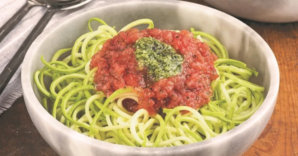 Pesto sos için tüm malzemeyi kıvam alana dek blenderden geçirin ve kenara alın. Kabakları spiral doğrayıcıdan geçirip geniş bir tabağa alın ve üzerine pesto sos gezdirerek harmanlayın. Üzerine dilerseniz domates sos veya yoğurt ekleyerek servis yapın.