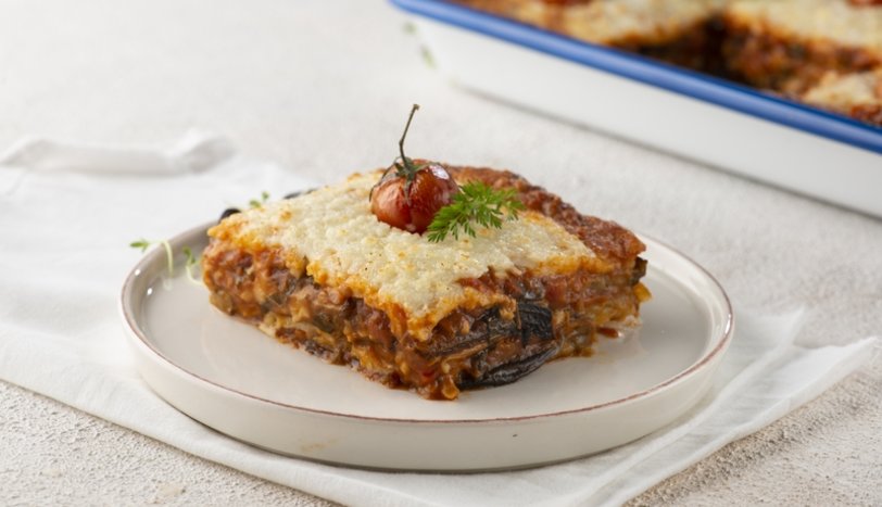 Rendelenmiş peynirin yarısını da ilave ederek sırasıyla kalan patlıcanı, domates sosunu ve peyniri yerleştirin. Üzerine kiraz domatesleri yerleştirin.