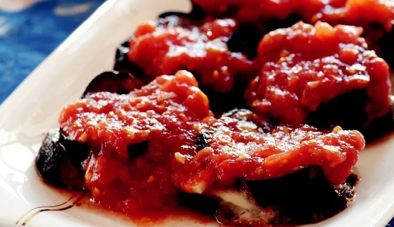 Patlıcanları alacalı soyun ve acısının çıkması için tuzlu suda 5-10 dakika bekletin. Suyunu süzüp, kağıt havlu ile kuruladıktan sonra 1 parmak kalınlığında ve halka şeklinde kesin. İki patlıcan diliminin arasına rendelenmiş peynir koyun ve kürdanla tutturun. Patlıcan ve peynir bitene kadar işleme devam edin. Kızdırılmış sıvı yağda kızartın ve kağıt havlu üzerinde fazla yağını alıp, servis tabağına koyun. Kabuğu soyulmuş ve rendelenmiş domatesi kıyılmış sarımsakla birlikte tavada 1-2 dakika çevirin ve patlıcanın üzerine gezdirin.