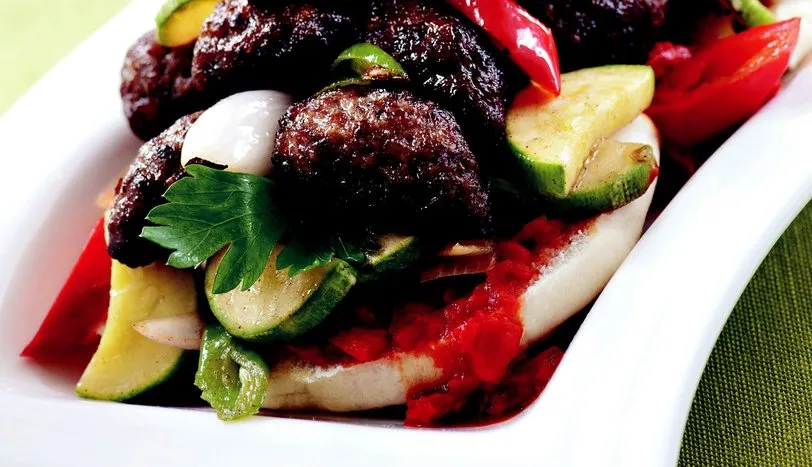 Köfte için derin bir kapta kıyma, galeta unu, rendelenmiş soğan, sarımsak, tuz, karabiber ve pul biberi iyice yoğurun. Harçtan küçük ceviz büyüklüğünde parçalar koparın. Elinizle şekil verip, kızdırılmış sıvı yağda kızartın. Sebze harcı için iri küpler halinde doğranmış kabak, dörde bölünmüş soğan ve halka kesilmiş kırmızı biberi, sıvı yağda hafifçe soteleyin. Sos için biber salçasını su ile tavaya alın ve 1-2 dakika karıştırarak pişirin. Pideleri dilimleyerek, servis tabağına alın. Üzerine salçalı sosu gezdirin. Sebzeli harcı üzerine yayın ve en üste de köfteleri yerleştirin. Yoğurtla birlikte servis yapın.