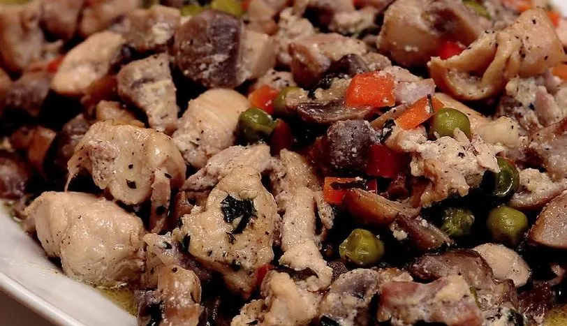 Mantarları limonlu suda temizleyin ve dörde bölün. Yağda suyunu çekene kadar kavurun. Tavukları ilave edin ve 10 dakika soteleyin. Bezelye, havuç ve tuzu ekleyerek, arada sırada suyunu kontrol edip, sebzeler pişene kadar sotelemeye devam edin. Ardından krema, karabiber ve maydanozu ekleyerek 5 dakika daha pişirin ve servis yapın.