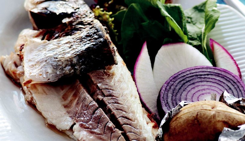 Balığı temizledikten sonra pulları ile birlikte ızgarada önlü arkalı pişirin. Servis tabağına alın. Halka şeklinde doğranmış soğan, fırınlanmış patates ve roka ile birlikte sıcak olarak servis yapın.