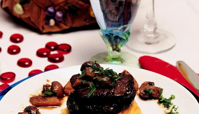 Bonfileleri havan tokmağı ile hafifçe dövün. Marinat için, ince doğranmış kereviz sapları, sarmısak zeytinyağı, şarap, tuz ve karabiberi karıştırın. Bonfileleri bu karışımda 12 saat bekleterek marine edin. Yapışmaz yüzeyli tavada, bonfilelerin iki yüzünükızartın. İnce doğranmış sarmısakları ilave edin. İkiye bölünmüş mantarları ve küçük elma dilimleri gibi kesilmiş kerevizleri ekleyip karıştırın. Tuz ve karabiberini ayarlayın. Orta ateşte suyunu çekinceye kadar pişirin. Şarap ekleyip alkolü uçuncaya kadar yüksek ateşte pişirmeye devam edin. Yemeğin suyu koyulaşınca, orta boy bir tepsiye yayın. Önceden ısıtılmış 200 derece fırında 10 dakika pişirin. Püre için patates ve havuçların kabuklarını soyup haşlayın. Çatalla ezin. Tuz, karabiber, zeytinyağı ve kremayı ekleyin. Kısık ateşte 4-5 dakika pişirin. Püreyi servis abağının ortasına yayın. Bonfileyi pürenin üzerine yerleştirin. Kereviz ve mantarları tabağın boş kalan bölümlerine yayıp, servis yapın.