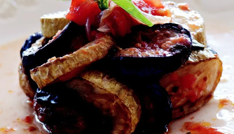 Patlıcan ve kabakların sap kısımlarını temizleyip kabuklarını soymadan halka doğrayın. Patlıcanların kararmaması için tuzlu suda dinlendirin. Zeytinyağının yarısını yapışmaz yüzeyli tavada kızdırın. Önce kabağı, sonra suyu süzülüp, kurulanmış patlıcanı ayrı ayrı hafifçe kızartın. Fazla yağını alması için kağıt havlu üzerine çıkartın. Kalan zeytinyağını yayvan bir tencereye alıp, kızdırın. Yarım ay şeklinde doğranmış soğan, jülyen doğranmış biber ve kıyılmış sarmısak ilave edip, soğan saydamlaşana dek kavurun. Küp doğranmış domates, tozşeker, fesleğen ve tuz ekleyin. Domatesler hafif yumuşayana dek pişirin. Başka bir tencerenin tabanına kabağı, sonra patlıcanı yerleştirin. Soğanlı harcı üzerine gezdirin. Su ilave edin. Tencerenin ağzını kapatacak kadar yağlı kağıdı ıslatıp fazla suyunu sıkın ve tencerenin üzerini sıkıca sarın. Kapağını kapatıp, kısık ateşte 15 dakika pişirin. Servis tabağının ortasına küçük çember kalıp yerleştirin. Kalıbın iç duvarlarını kabak ve patlıcanla kaplayın. Ortasını soğanlı harçla doldurun. Üzerini patlıcan ve kabakla kapatın. Çemberi çıkarıp üzerine fesleğen yerleştirerek servis yapın.