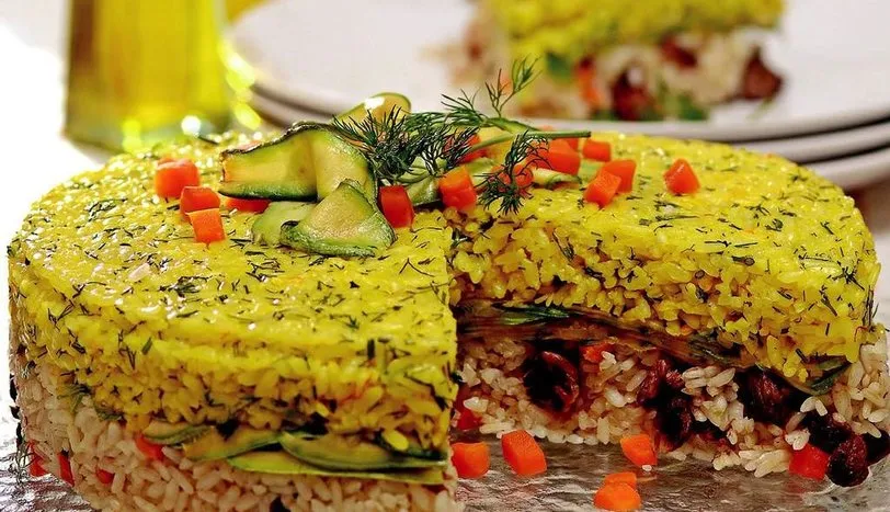 5- Kelepçeli bir kabı suyla ıslatıp safranlı pilavı elinizle bastırarak kabın dibine yerleştirin. Kabaklardan 5- 6 dilimini ayırıp, kalanlarını safranlı pilavın üzerine düzgün bir şekilde yerleştirin. Etli pilavı kabakların üzerine koyup düzeltin. Kalıbı servis tabağına ters çevirerek çıkarın. Ayırdığınız kabak ve havuçla süsleyin. Dilimleyerek servis yapın.