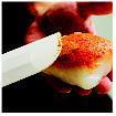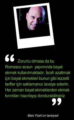 2. Balığın üstünü kaplayacak Romesco sosu için kırmızıbiberin kabuğu kararana kadar sıcak ızgara altında kavurun. Bir kaba koyup streç filmle iyice kapatın. Soğuduğunda biberlerin kabuklarını elle soyup ikiye ayırın ve çekirdeklerini çıkarın.