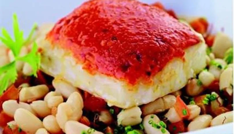 Morinanın üstüne bir kaşık romesco sosu sürün ve fırın tepsisine yerleştirin. Balığı 200ºC'de 15 dakika pişirin. Safranlı haşlanmış fasulyeyi 4 kaba ayırın ve üstlerine romesco soslu morina filetolarından birer adet koyun.