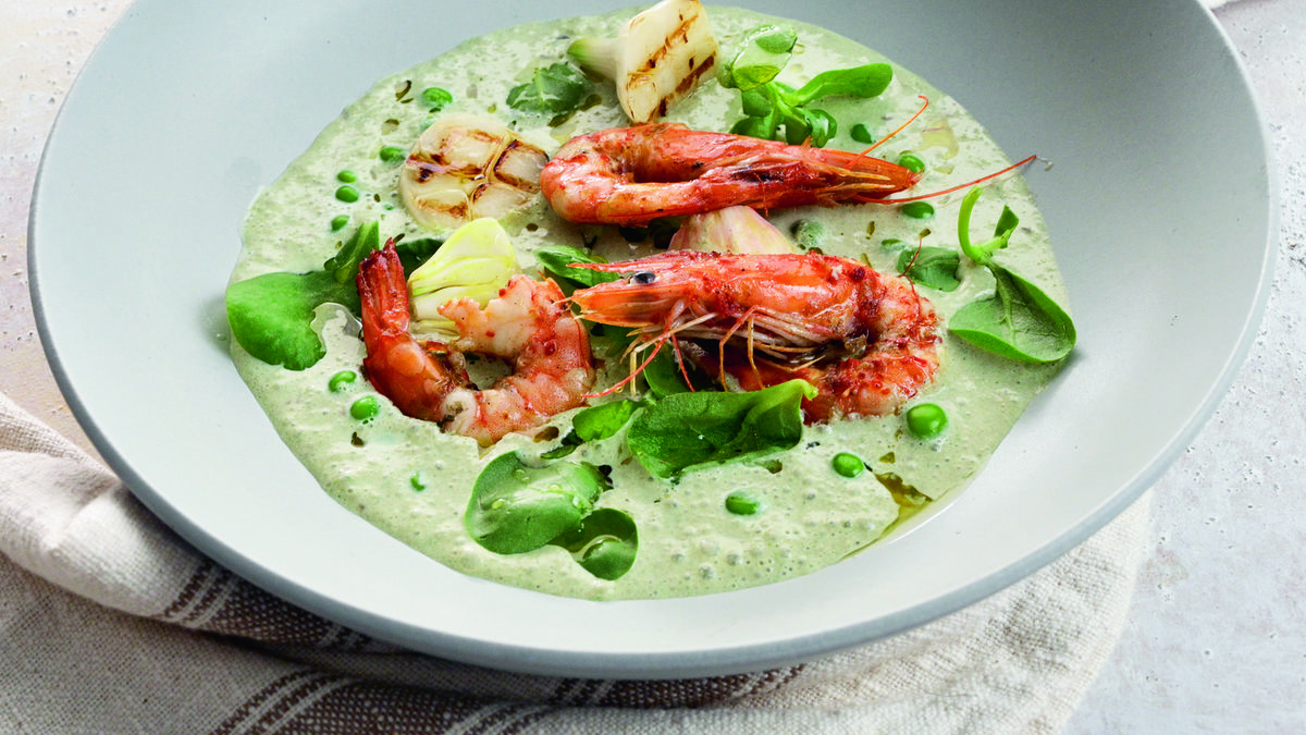 Servis tabağına sarımsaklı kremayı aktarın, üzerine karidesleri, semizotu yapraklarını, haşlanmış bezelye içini yerleştirin. Bekletmeden servis yapın.
