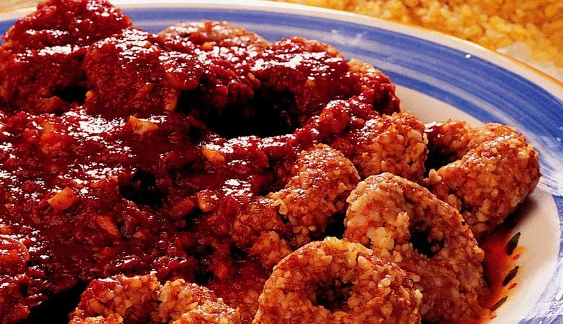 Bulguru yıkayıp, tuz ve 1 çay bardağı su ile iyice şişene dek yoğurun. Kıyma, biber salçası, tuz ve karabiberi ekleyip, yoğurmaya devam edin. Fındık büyüklüğünde parçalar koparıp, elinizle yuvarlayın. Hafifçe yassıltın. Parmağınızla ortasına hafifçe bastırıp, minik bir çukur açın. Unlanmış tepsiye dizin. Sosu için, sarmısakları soyup, dövün. Tereyağı ile çok az kavurun. Diğer malzemeyi ekleyerek, sosu hazırlayın. Bol su kaynatıp köfteleri 6-7 dakika haşlayın. Delikli kepçe ile çıkartıp, servis tabağına alın. Üzerine hazırladığınız sosu döküp, servis yapın.