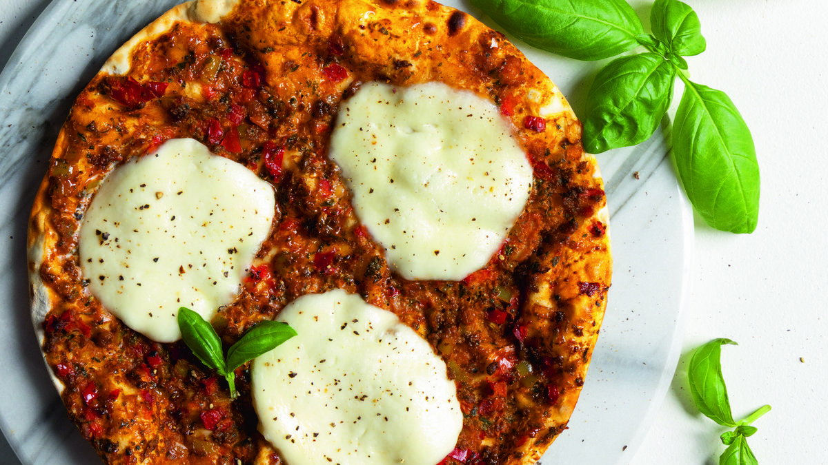 Açılan hamurların üzerine harcı pay edip, yayın. Önceden ısıtılmış 200 derece fırında hamur pembeleşip çıtırlaşana dek pişirin. Fırından çıkarmadan 2 dakika önce halka dilimlenmiş mozarella peynirini pizza hamurlarının üzerine koyun. Peynirler hafif eriyene dek pişirip çıkarın. Fesleğen yaprağı ve karabiber ile süsleyip servis yapın.