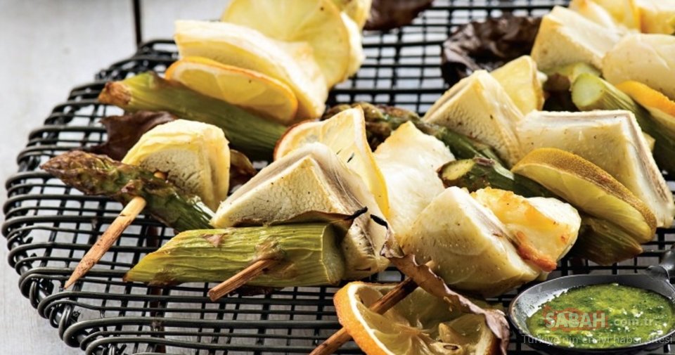 Hellim peynirini 1 cm genişliğinde dilimleyin. Limonu ince dilimleyip, tüm malzemeyi şişlere geçirin. Üzerlerine zeytinyağlı tuzlu karışımı sürüp, önceden ısıtılmış 200 derece fırında kontrol ederek pişirin. Sıcak şişleri sosla birlikte servis yapın.