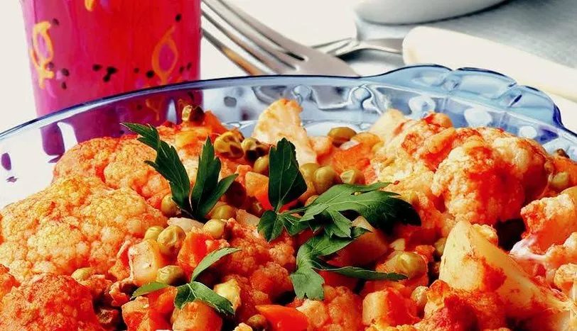 HAVUCU temizleyip küp küp doğrayın. Bezelyeyle birlikte yarı yarıya haşlayın. Karnabaharı yıkayıpçiçeklerini ayırın. Isıya dayanıklı bir cam kaba karnabaharları dizin. Üzerine haşlanmış bezelye vehavuçları serpiştirin. Domatesi ve sarmısakları rendeleyin. Salçayı 1 su bardağı su ile açıp, rendelenmişdomatesle karıştırın. Malzemeye kekik ve sarmısağı ekleyip tekrar karıştırın ve karnabaharların üzerine gezdirin. Yumurtayı başka bir kapta çırpıp karnabaharları n üzerine ekleyin. Üzerini bir folyo ile kapatın. Önceden ısıtılmış 180 derece fırında karnabaharlar yumuşayana kadar pişirin.