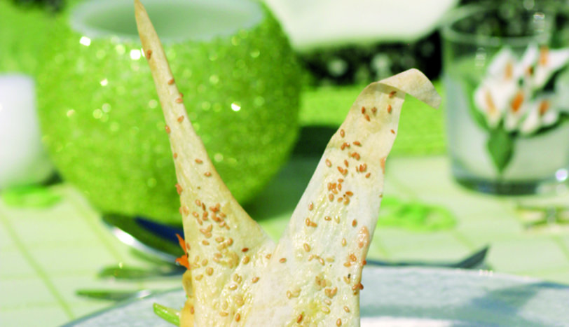 YapIşmaz yüzeyli tavaya biraz yağ sürün. Krep malzemesini derin bir kapta çırpın. Tavaya birer kepçe bu malzemeden boşaltın. Önlü arkalı pişirin. Ayrı bir yerde, jülyen doğranmış biberleri zeytinyağında soteleyin. Jülyen doğranmış havuç, kabak ve en son soya filizini ekleyip sotelemeye devam edin. Soya sos, sarmısak, karabiber ve tuz ekleyip, sebzeleri ocaktan alın. Kreplerin içine sebzeli malzemeyi paylaştırıp, rulo biçiminde sarın. 2-3 dakika orta ısılı fırında tutup, kremalı yoğurt sosla servis yapın.